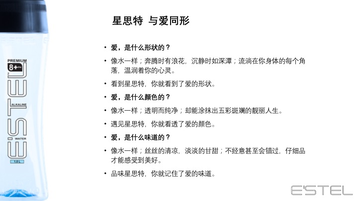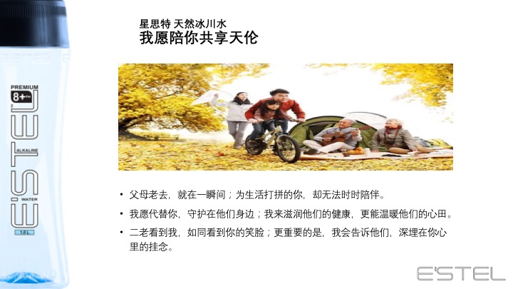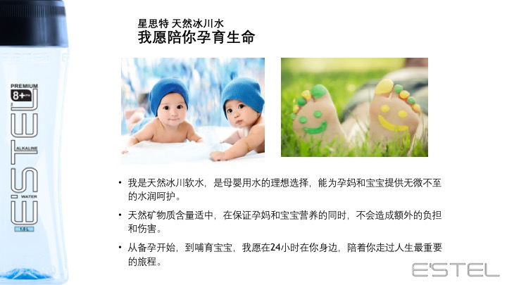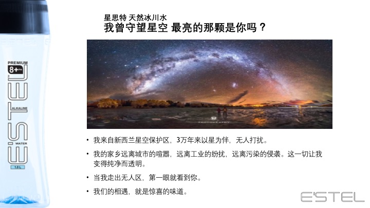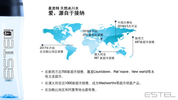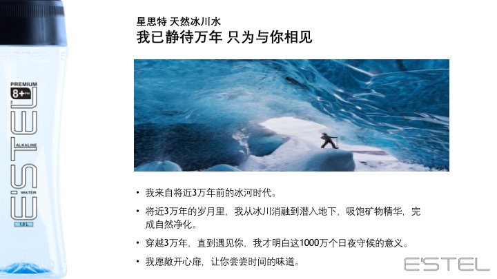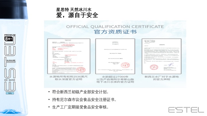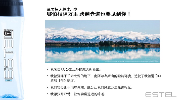源自新西兰的冰川臻藏——E'STEL天然碱性冰川软水 身心相随 碱单生活 E'STEL天然碱性冰川软水取自PURE新西兰积雪覆盖的南阿尔卑斯山脉地下2936英尺,经过30000年远古冰川层层过滤,EVERY DROPS都成为珍贵的PH8.0+天然弱碱性冰川软水。E’STEL铂金碱性水入口丝滑,味道甘甜PURE,天然矿物元素平衡身体健康,行销新西兰本地及澳大利亚1566家超市,开启纽澳饮用健康天然水的新潮流。